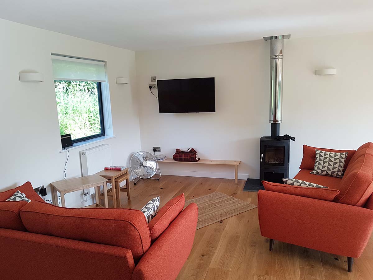 Living area: wood burning stove, 2 three-seater sofas, large dining table with 6 chairs and 43″ TV with freesat tv & WIFI